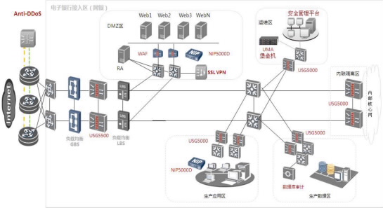 華為深入分析銀行網(wǎng)銀業(yè)務(wù)特點(diǎn),提供最前端Anti-DDoS防御,以及網(wǎng)銀內(nèi)部業(yè)務(wù)區(qū)的安全訪問控制、攻擊威脅檢測防御等,還提供專業(yè)安全審計,安全運(yùn)維管理解決方案,為客戶構(gòu)建專屬網(wǎng)銀業(yè)務(wù)區(qū)安全管理平臺。其整體網(wǎng)銀安全解決方案部署示意圖如下所示:
