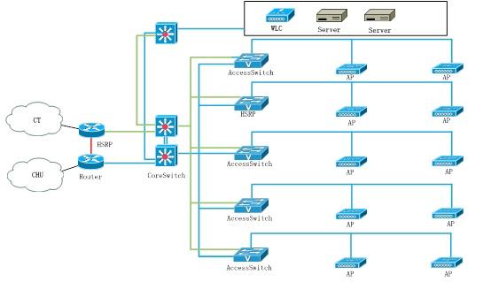 一到五樓面積一樣,每層樓布局幾乎一樣,人數較多,所以在第一樓到5樓部署AP2602 ,每層樓AP通過網線連接到樓層的訪問層交換機上(AccessSwitch),訪問層交換機是支持PoE供電,所有AP通過網絡供電。核心機房在三樓,在服務器區交換機上連接5508無線控制器,無線控制器采用端口聚合的方式與服務器交換機相連。
