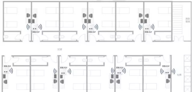面板式及桌面式AP 天線輻射方向比較均勻,適合于安裝在有隔墻的房間內部,例如酒店客房或者辦公室等,建議的1 個AP 覆蓋1-2 間房間,覆蓋方法如下圖所示: