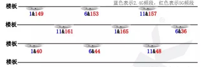 在頻段帶寬為20MHz 的條件下,在2.4G 頻段,1、6、11 信道理論相互不會干擾;5G頻段36、40、44、48、149、153、157、161、165 信道理論相互不干擾。工程完成后,配置過程需要根據AP 的安裝位置,手動指定各個AP 的無線信道。