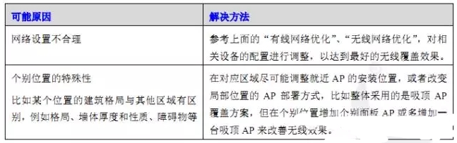 在測試時,我們可能會發現個別位置的無線覆蓋效果不好,比如搜不到無線信號或信號微弱,很難連上,或者上網的速度慢,無法滿足正常使用需求。類似情況的原因和解決方法可參考下表: