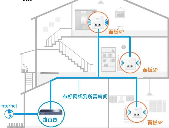 使用面板式AP的方式組網,實現全方位無線覆蓋。面板AP方案,是由一個主路由和多個面板AP組合而成,主路由器與面板AP之間通過家里預埋的網線傳輸信號, 面板AP可直接替換家里原有網絡面板,無需重新布線,不破壞原有裝修。