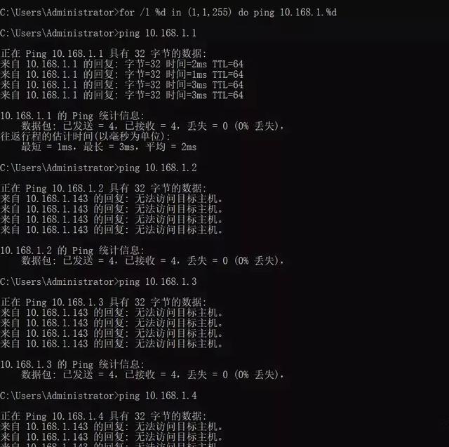 那么這段“for /L %D in(1,1,255)do ping 10.168.1.%D” 代碼是什么意思呢?
