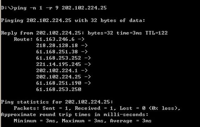 ping -n 1 -r 9 202.102.224.25 (發送一個數據包,最多記錄9個路由)
