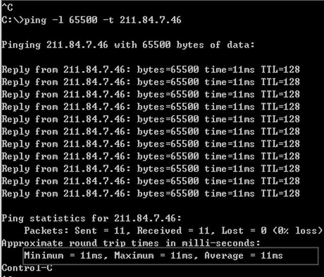 在默認的情況下Windows的ping發送的數據包大小為32byt,最大能發送65500byt。當一次發送的數據包大于或等于65500byt時,將可能導致接收方計算機宕機。所以微軟限制了這一數值;這個參數配合其它參數以后危害非常強大,比如攻擊者可以結合-t參數實施DOS攻擊。(所以它具有危險性,不要輕易向別人計算機使用)。