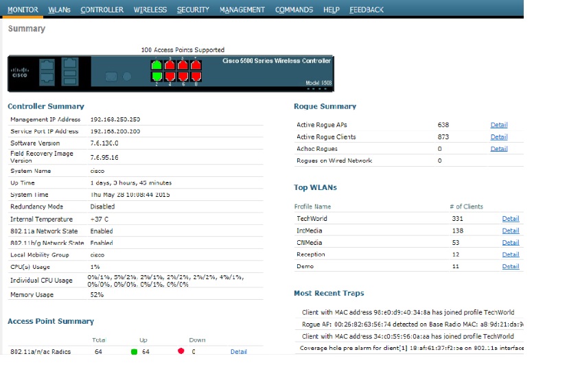 | * 無線峰值連接人數(shù)為1000人左右,4樓會場內(nèi)部2.4GHz癱瘓,無線進(jìn)行了射頻調(diào)優(yōu),1000終端中有800多終端連接5GHz,5GHz上網(wǎng)穩(wěn)定、流暢。 |
